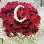 gypsophila - 6 pcs red equadorian rose - 30 pcs presonalized initials - 1 pcs