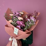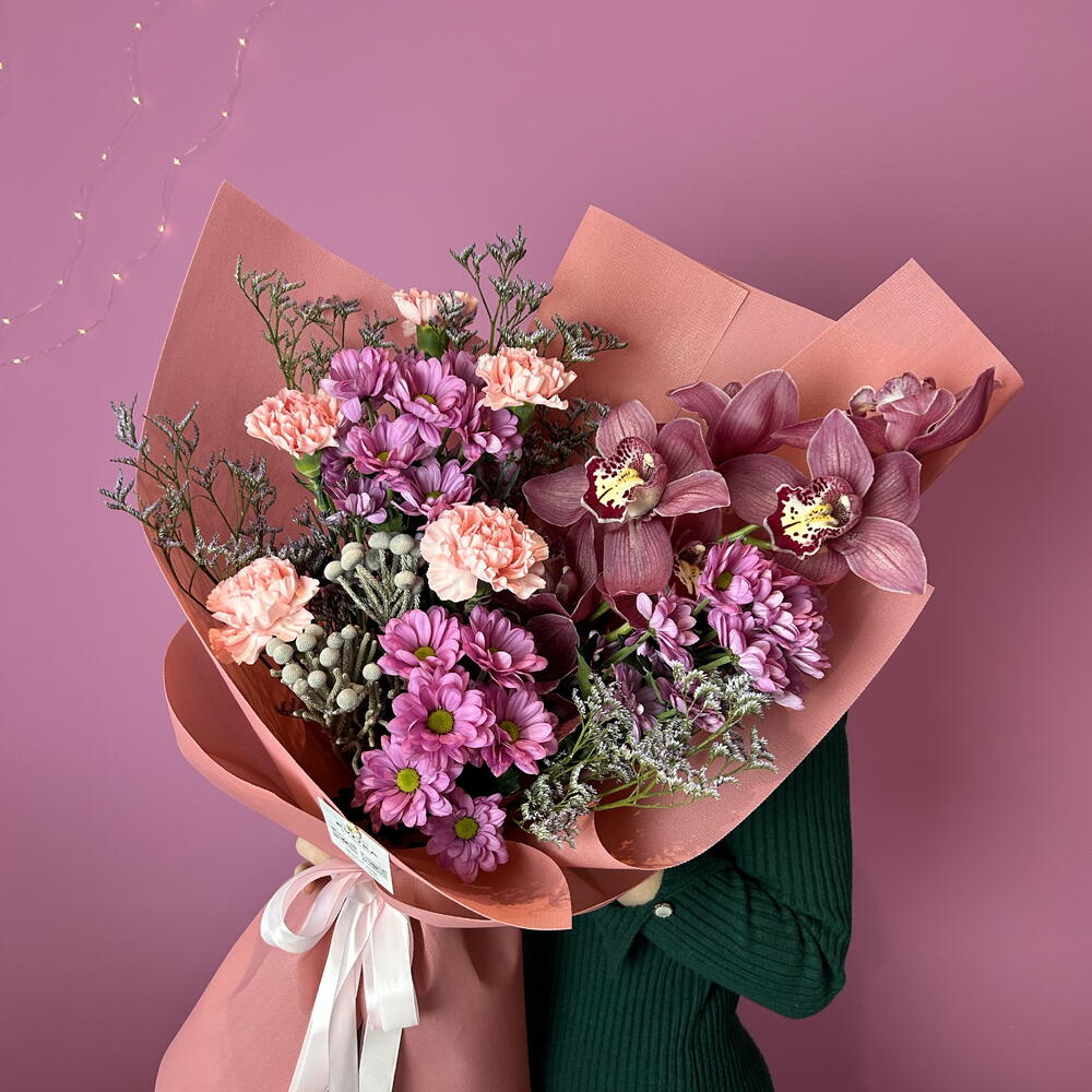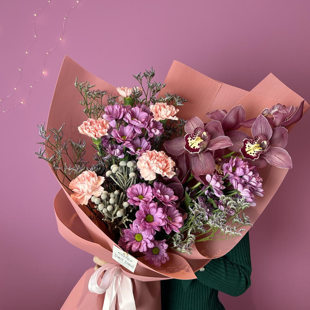 Brunia - 2 pcs Limonium - 3 pcs cymbidium - 1 pcs aquabox - 1 pcs carnations - 5 pcs chrysanthemums - 3 pcs decorative paper - 1 pcs