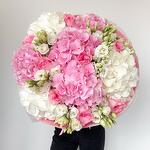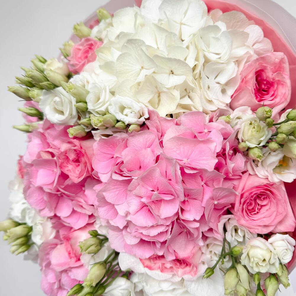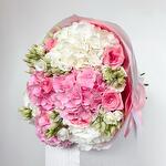 Pink rose - 9 pcs white hydrangea - 4 pcs pink hydrangea - 3 pcs white eustoma - 7 pcs