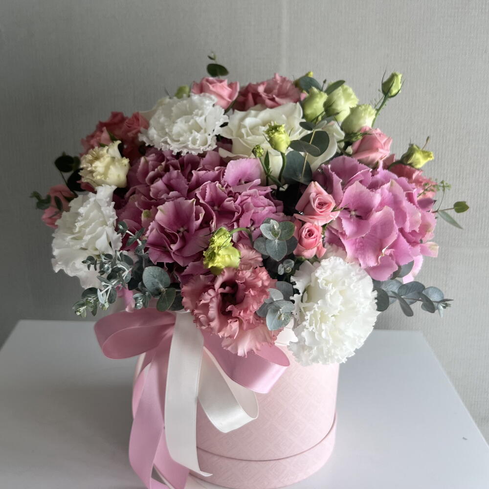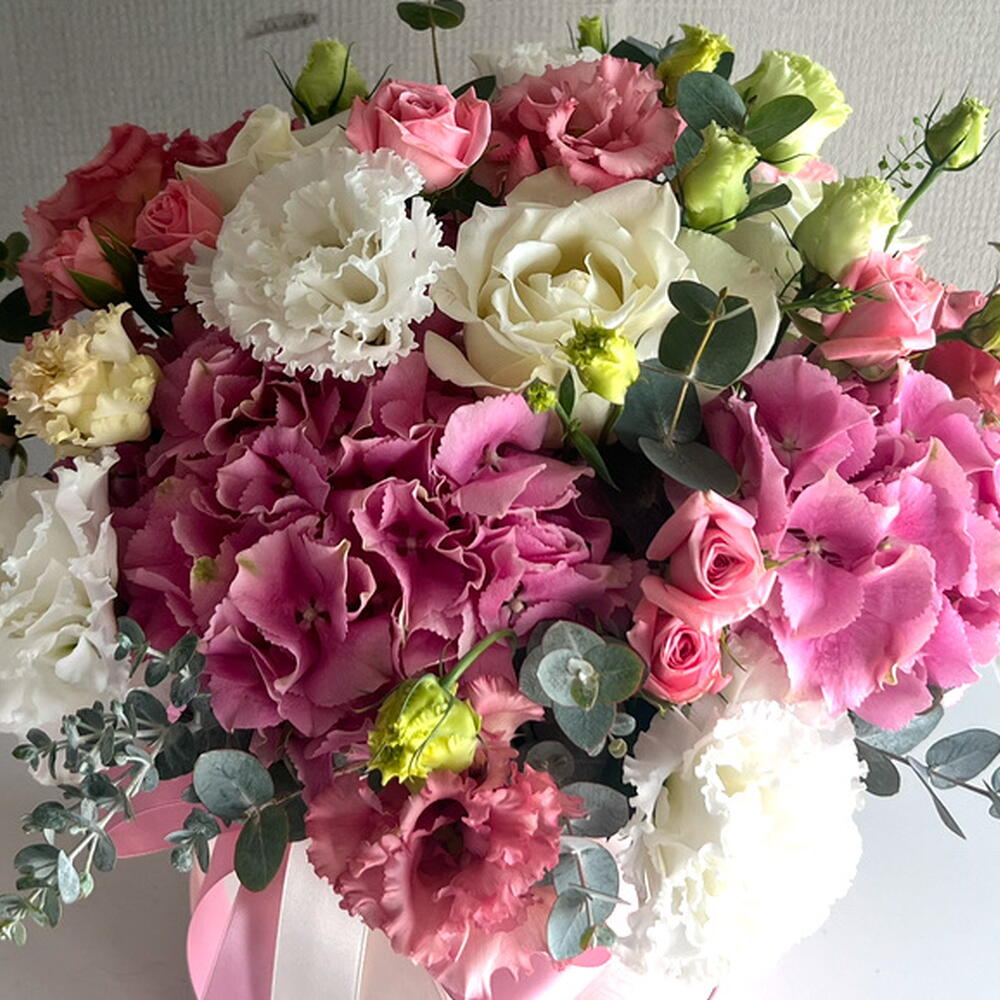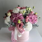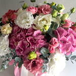 Hydrangea - 1 pcs Lisianthus - 5 pcs seasonal flowers - 3 pcs greenery - 5 pcs roses - 6 pcs