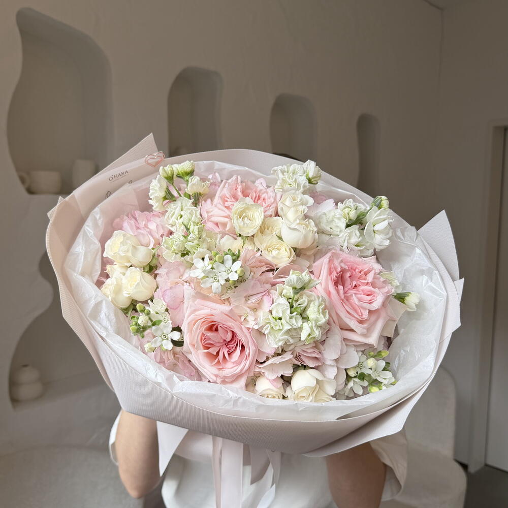 Hydrangea - 4 pcs matthiola - 6 pcs oxypetalum - 4 pcs ohara rose - 3 pcs princess fairy - 4 pcs