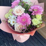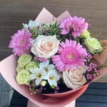 Spray rose - 3 pcs Freesia - 2 pcs Pistachio - 2 pcs paper - 2 pcs gerber - 3 pcs roses - 3 pcs samelacium - 2 pcs