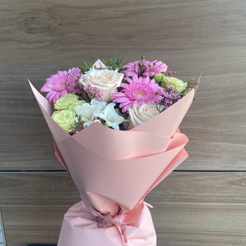 Spray rose - 3 pcs Freesia - 2 pcs Pistachio - 2 pcs paper - 2 pcs gerber - 3 pcs roses - 3 pcs samelacium - 2 pcs