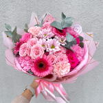 Eucalyptus - 5 pcs Spray rose - 2 pcs Pink rose - 3 pcs pink Gerbera - 3 pcs dianthus - 5 pcs pink chrysanthemum - 1 pcs