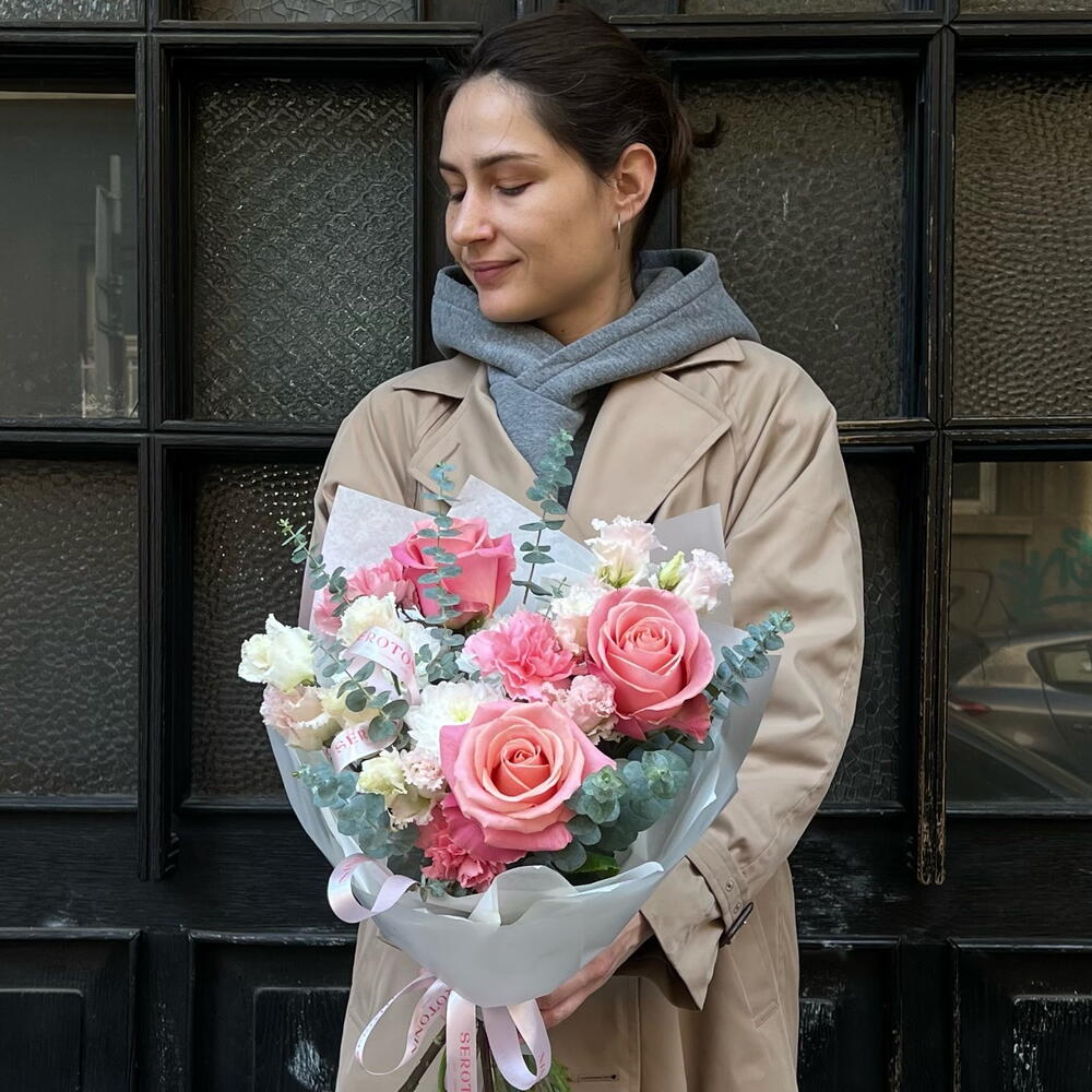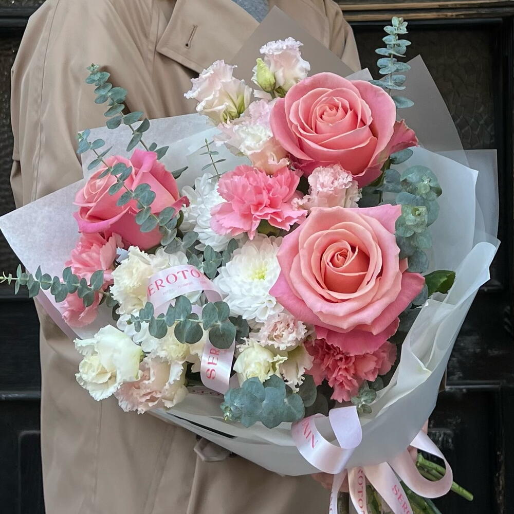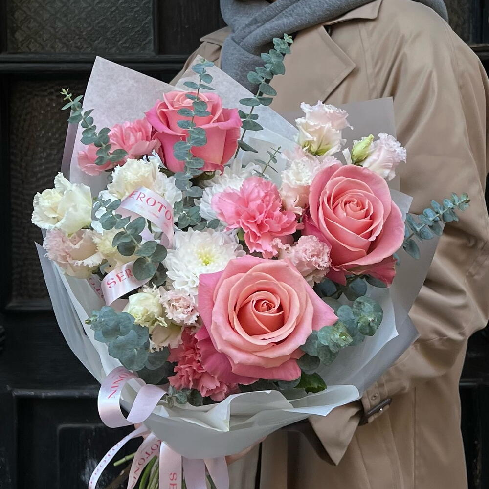 Eustoma - 2 pcs Eucalyptus - 2 pcs rose - 3 pcs diantus - 3 pcs chrysanthemum - 1 pcs
