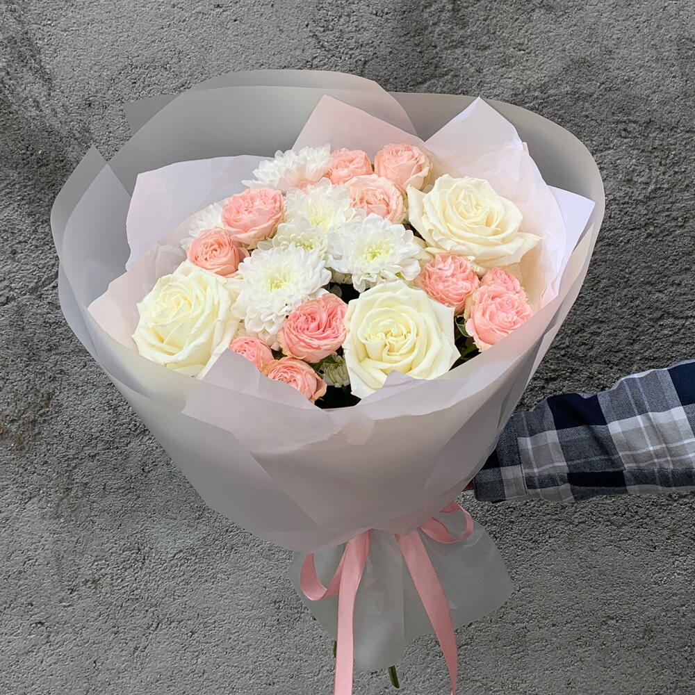Ribbon - 1 pcs Spray rose - 4 pcs rose - 3 pcs packaging - 3 pcs chrysanthemum - 3 pcs