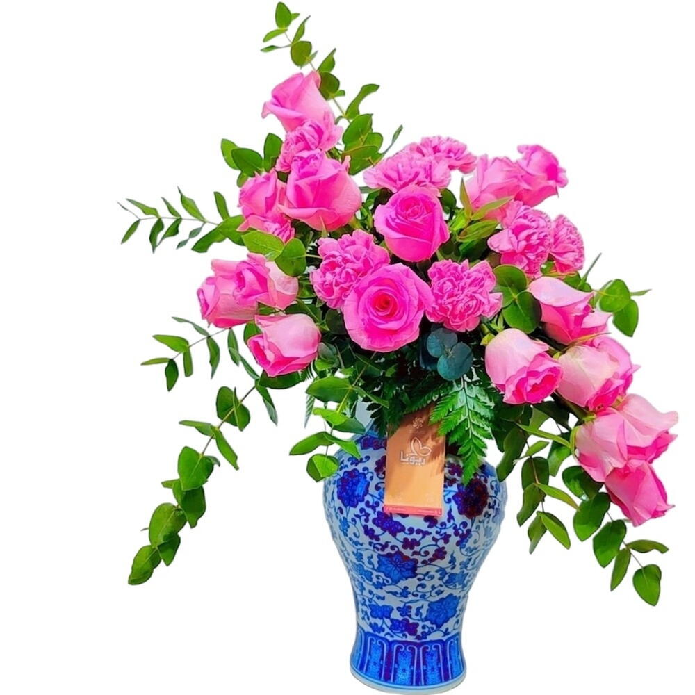 Ceramic vase arranged with pink roses, pink carnation and eucalyptus