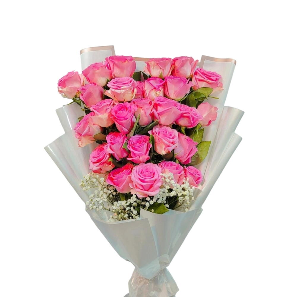 Pink roses wrapped in a white paper