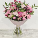 A beautiful hand-tied bouquet of pink and pastel flowers and greenery selected by our florists. All flower are unique, that’s why the photo is of an informational nature. The color, size and form of the flower that you see in the photo may vary.
