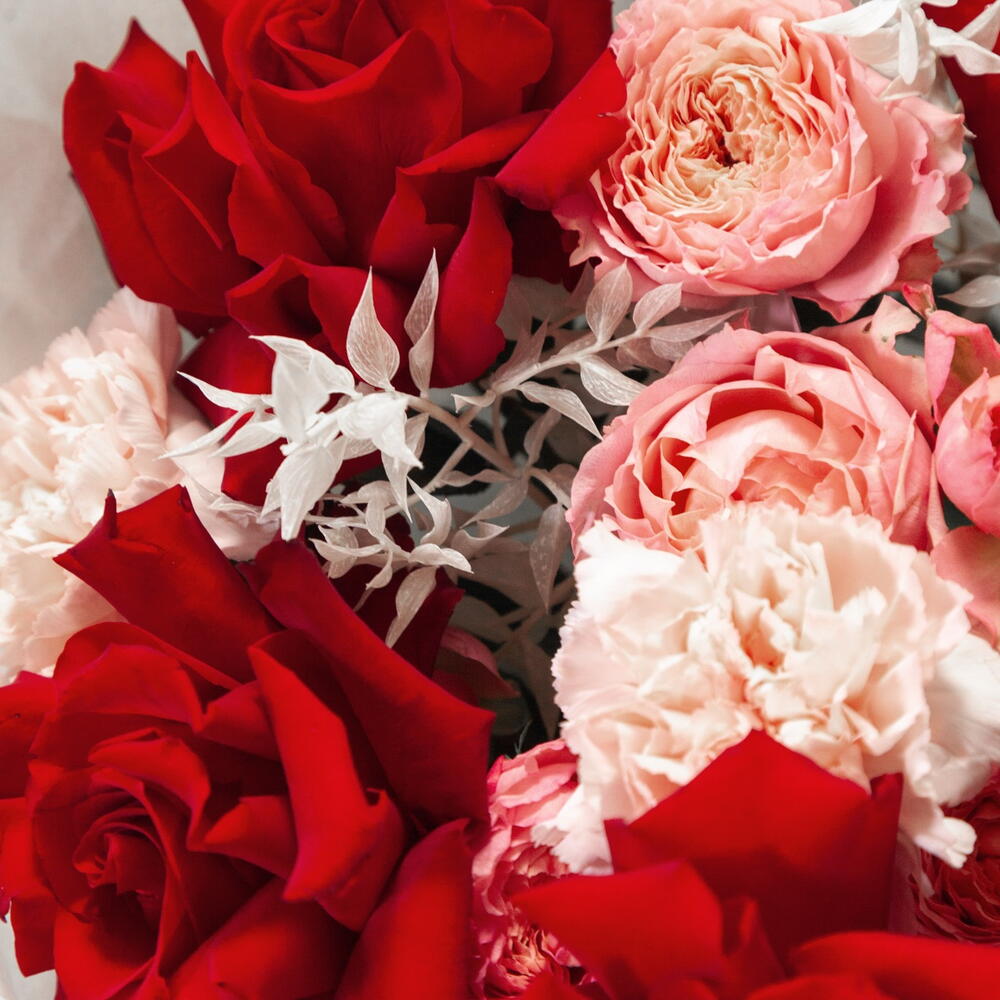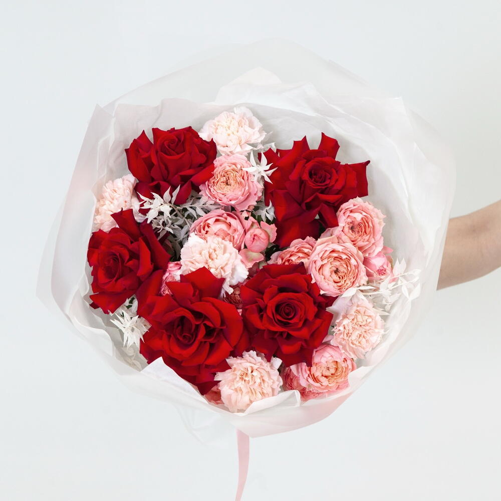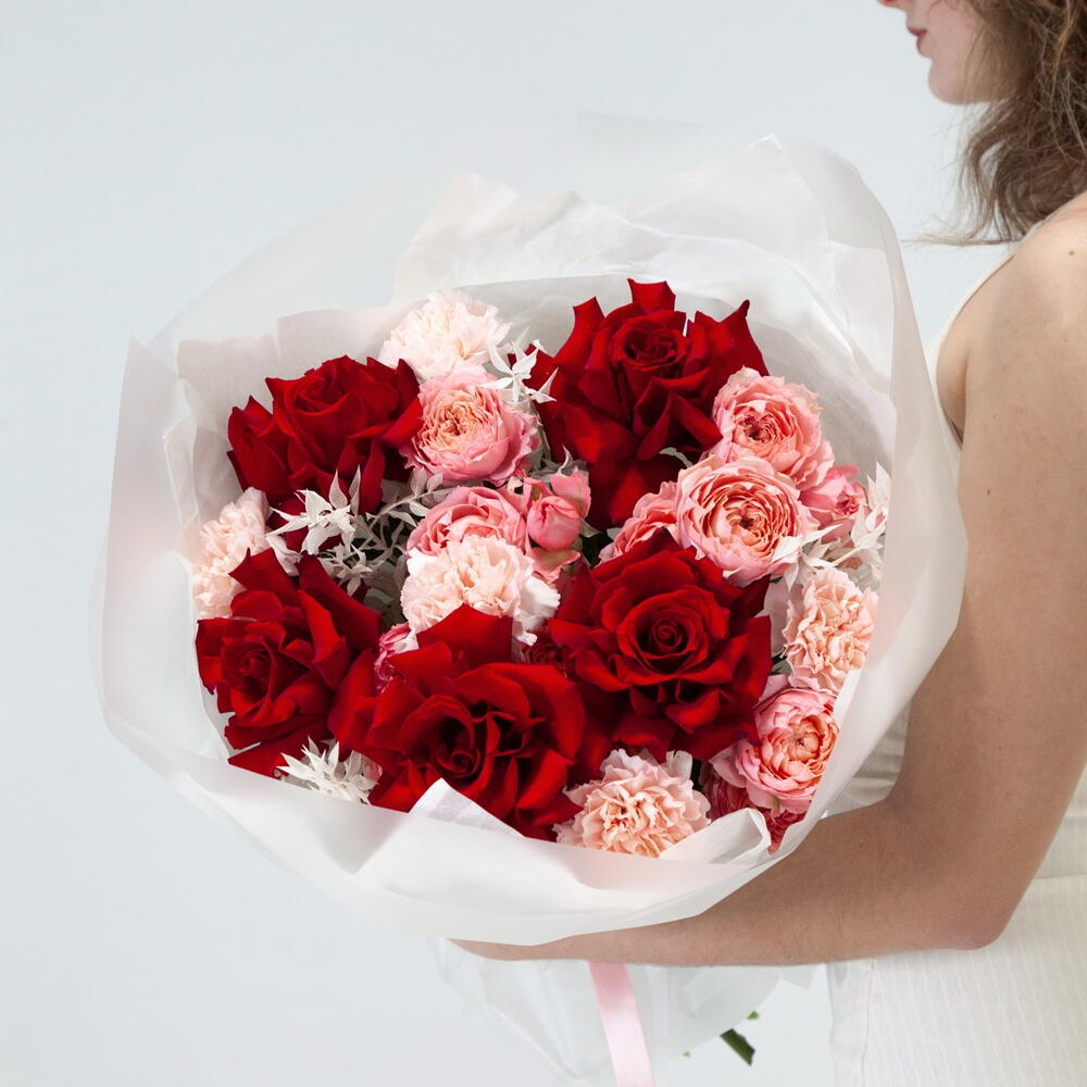 Ribbon - 1 pcs Ruscus - 2 pcs rose - 5 pcs packaging - 3 pcs dianthus - 5 pcs juliet rose - 4 pcs