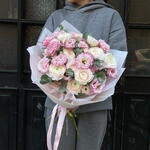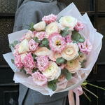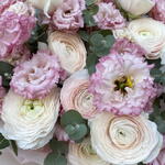 Ribbon - 1 pcs Eustoma - 7 pcs Eucalyptus - 3 pcs ranunculus - 9 pcs