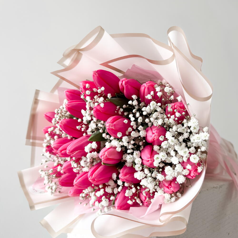 pink tulips - 31 pcs white gypsophila - 5 pcs