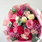 Eucalyptus - 9 pcs White rose - 7 pcs dark pink rose - 7 pcs gypsophila pink - 5 pcs
