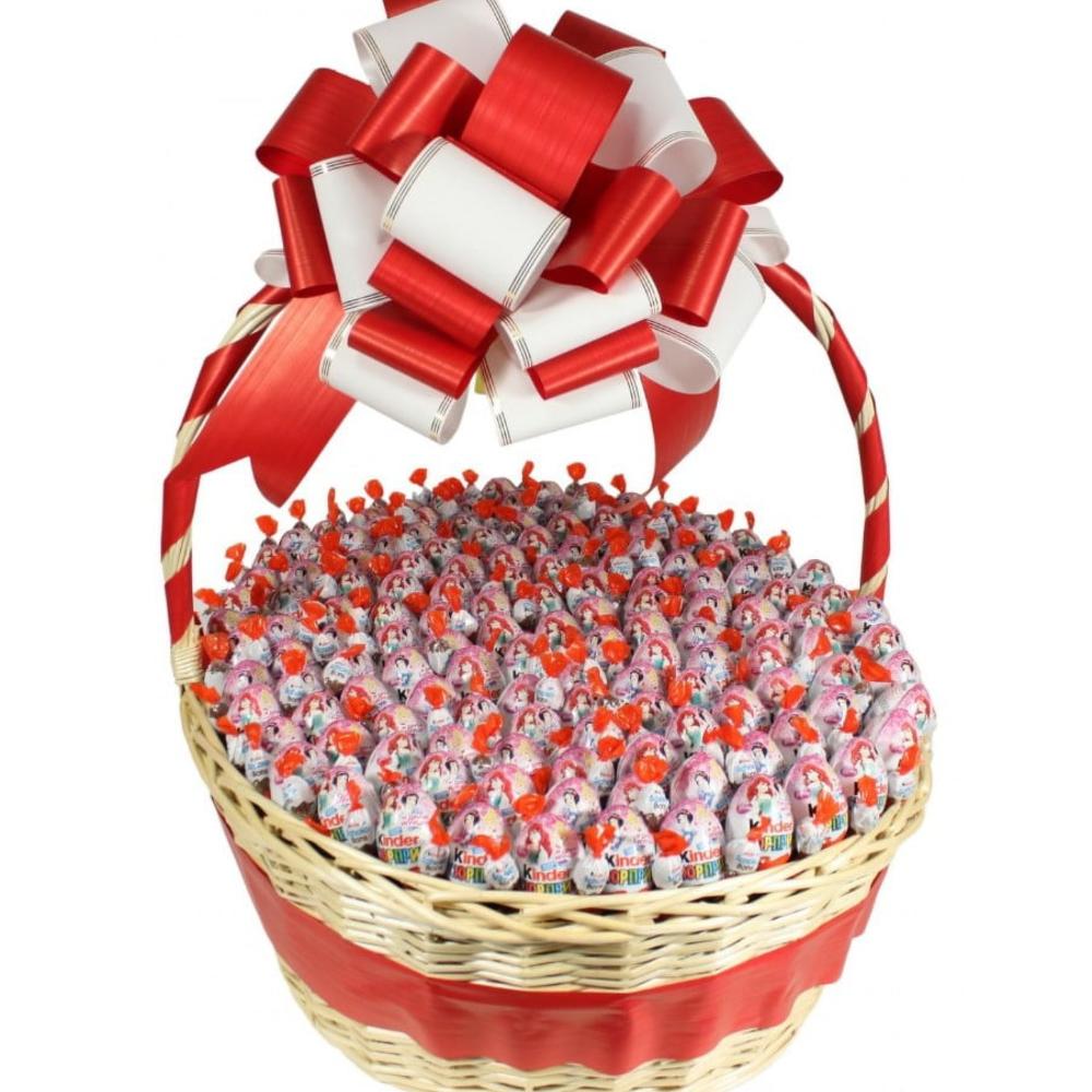 Basket kinder surprises Surprise is the taste of childhood and unforgettable memories. The egg of milk chocolate has an inner layer of white chocolate with the surprise. Nobody knows which toy is inside the egg and this is the main charm of the gift. Especially romantic this gift makes a lovely wicker basket, decorated with red satin ribbon. This gift will be delighted adults and children. Basket kinder surprises will be magical and memorable gift for your loved ones!