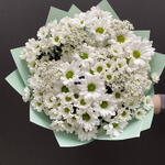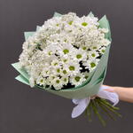 This is a classic bouquet of white daisies, symbolizing purity, innocence and delicacy. The composition delights with its freshness and natural charm. Kept in an elegant, minimalist style, decorated with light-green paper and tied with a white ribbon, it looks light and subtle. Carefully selected flowers create a harmonious whole that draws the eye with its simplicity. Perfect for any occasion – from birthdays and name days to expressions of gratitude, appreciation or heartfelt congratulations. It’s an excellent choice for those who value classic, timeless elegance. Simple, yet full of charm and freshness. Attention! If the customer does not answer the phone to agree on bouquet details, its composition may be changed to flowers currently available in the warehouse. However, we guarantee maintaining the same style, color scheme and overall character of the arrangement.