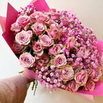 Puokštę sudaro smulkiažiedė rožė Leila ir rožinė gipsofila. Puokštė nuotraukoje yra M dydžio. Įpakavimas įskaičiuotas į puokštės kainą.