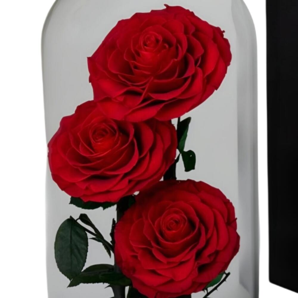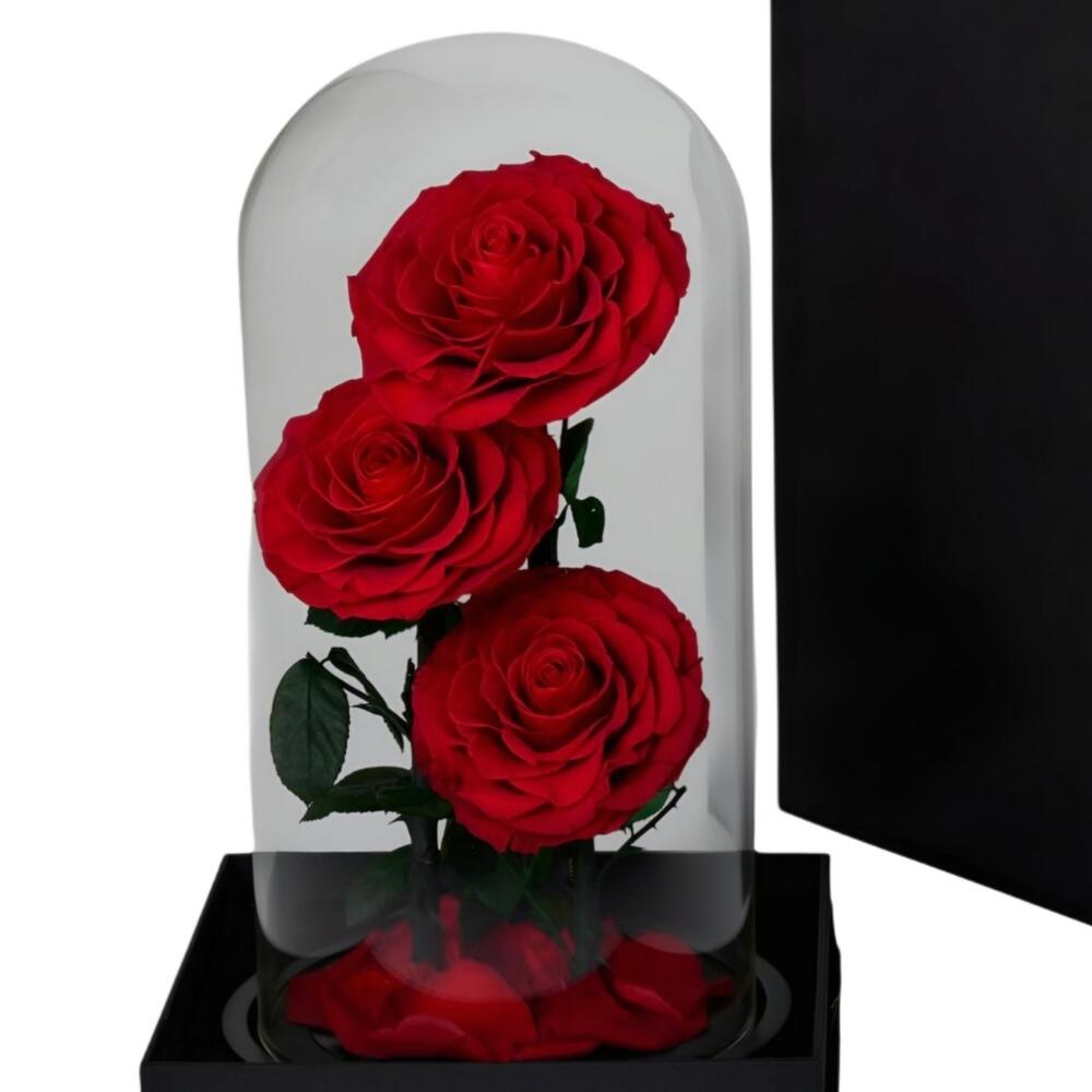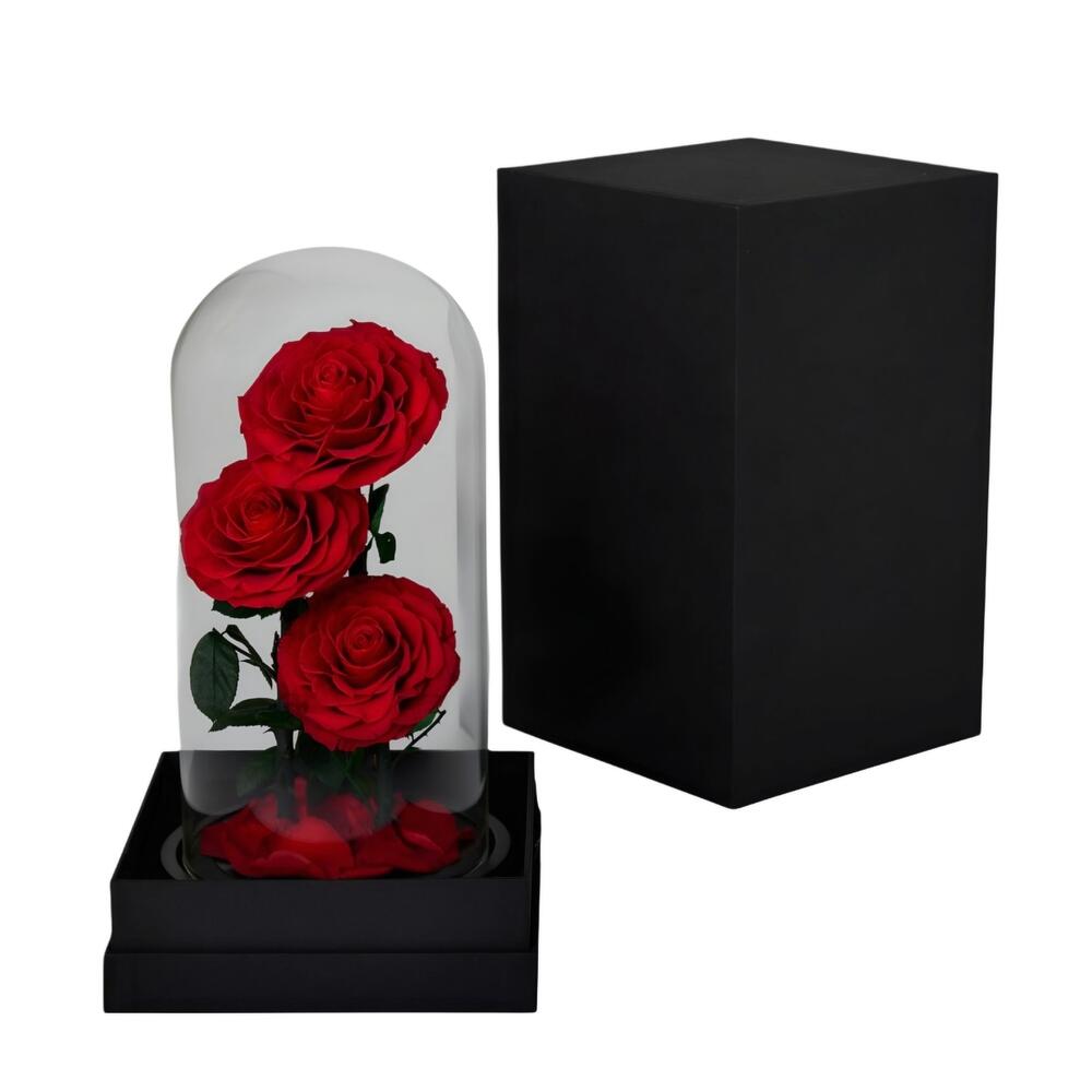 3 preserved roses in a glass bell that comes in a black box. The box is tied with a ribbon.