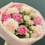 Satin ribbon - 5 pcs carnation - 5 pcs rose ecuador - 5 pcs designer packaging - 3 pcs bush rose - 3 pcs decorative greenery - 5 pcs