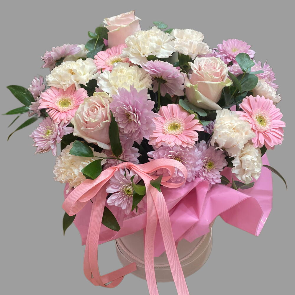 Gerbera - 5 pcs rose - 7 pcs carnations - 7 pcs daisy - 3 pcs box - 1 pcs floral foam - 2 pcs