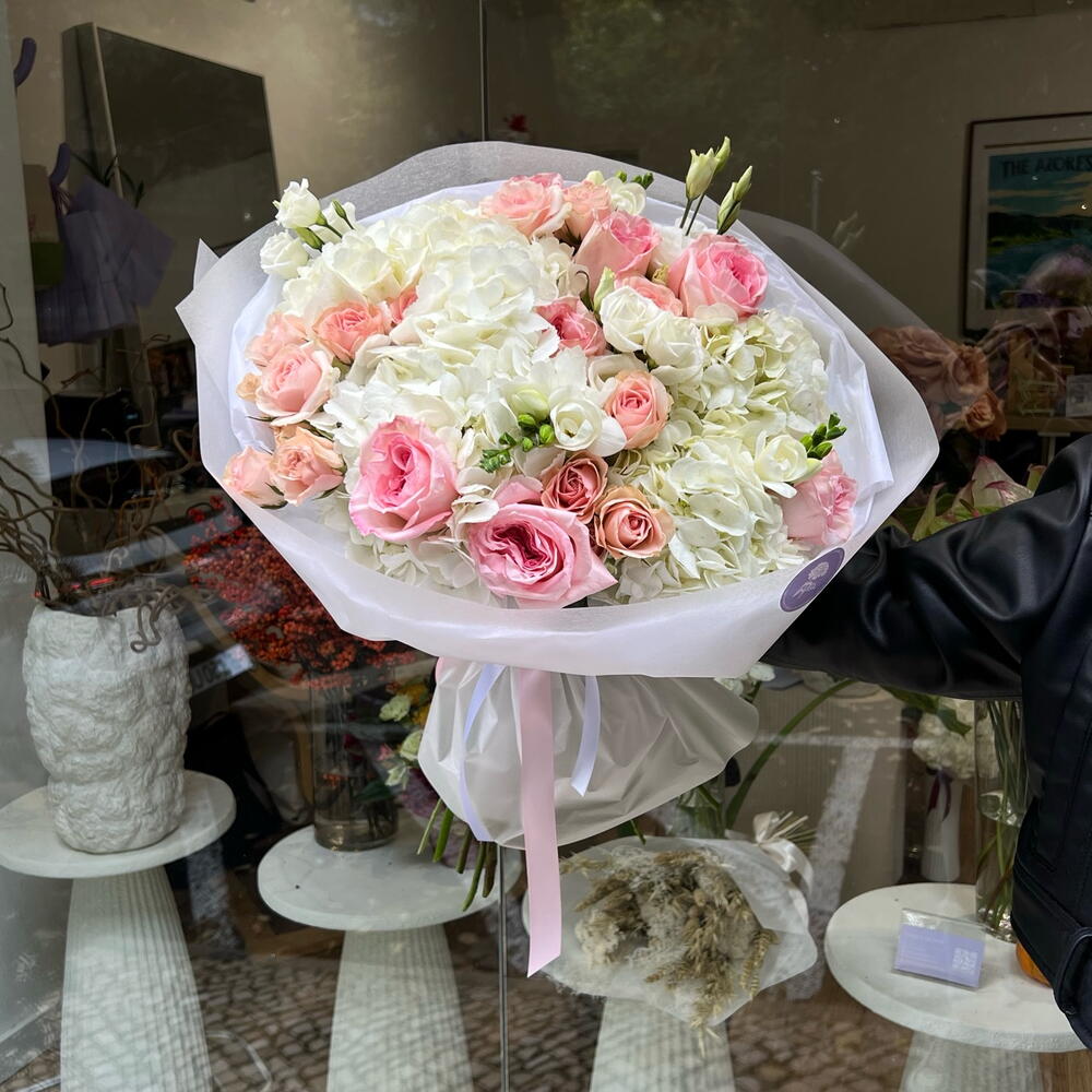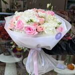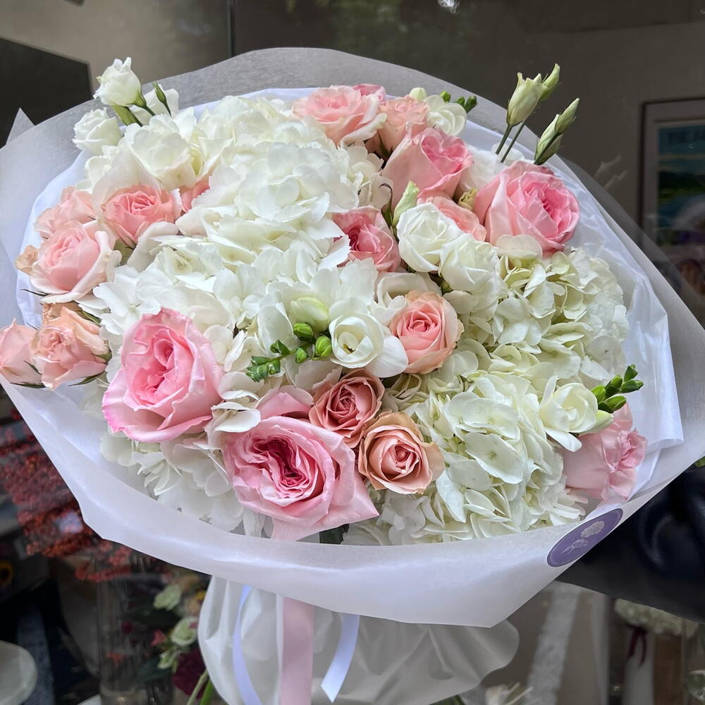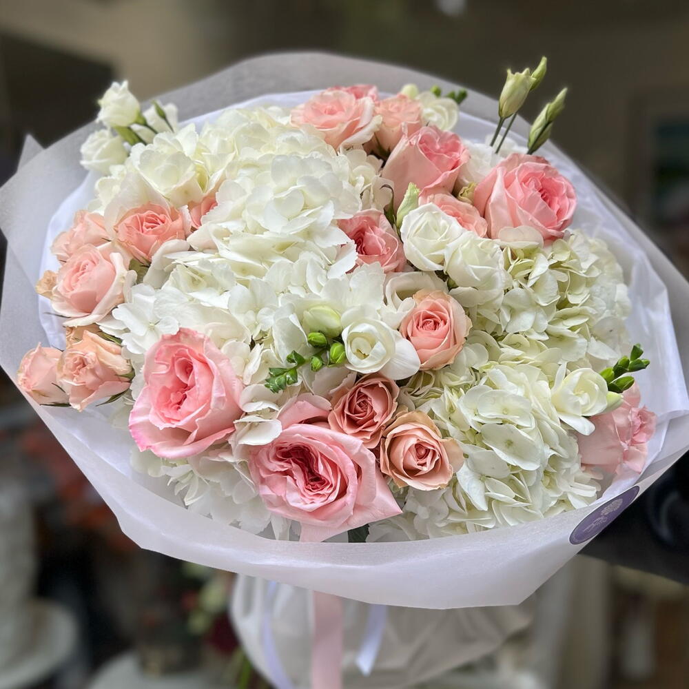 Spray rose - 5 pcs Freesia - 3 pcs Pink rose - 5 pcs Lisianthus - 3 pcs hydrangeas - 5 pcs