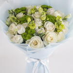 A hand bouquet of white roses, green chrysanthemum buds and lisianthus wrapped in blue wrapping.