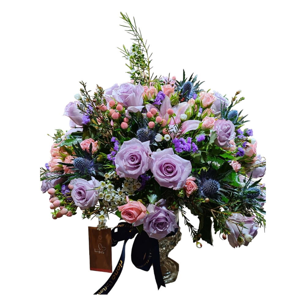 Nice glass Vase Arrangement with purple and pink roses together with elingium and pink berries