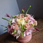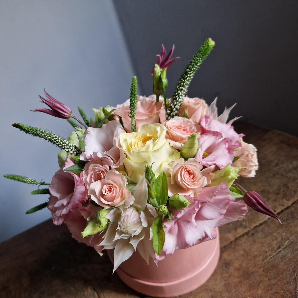 Veronica - 2 pcs Eucalyptus - 1 pcs Spray rose - 2 pcs Clematis - 1 pcs Lisianthus - 1 pcs rose - 1 pcs english rose - 1 pcs