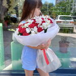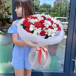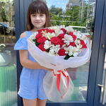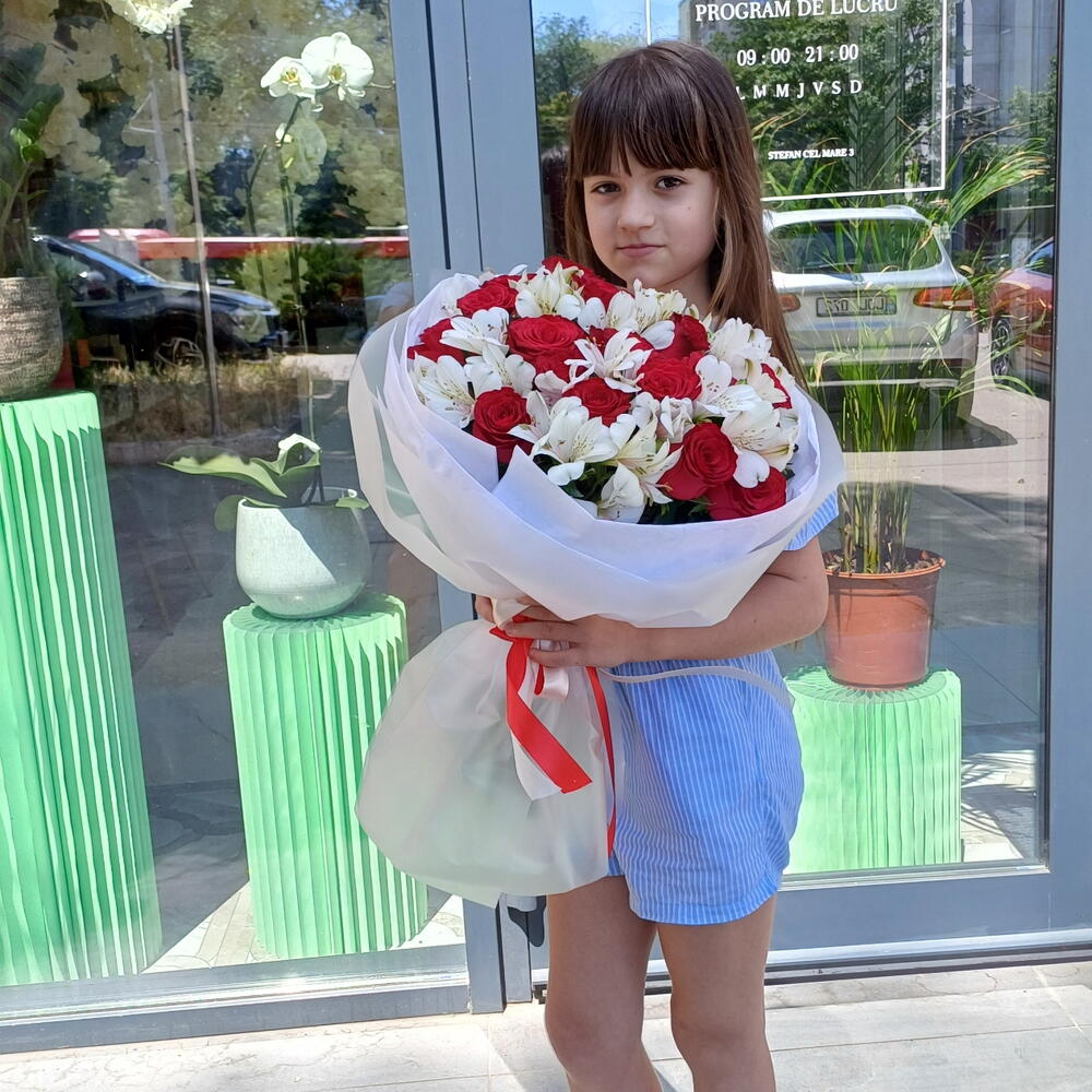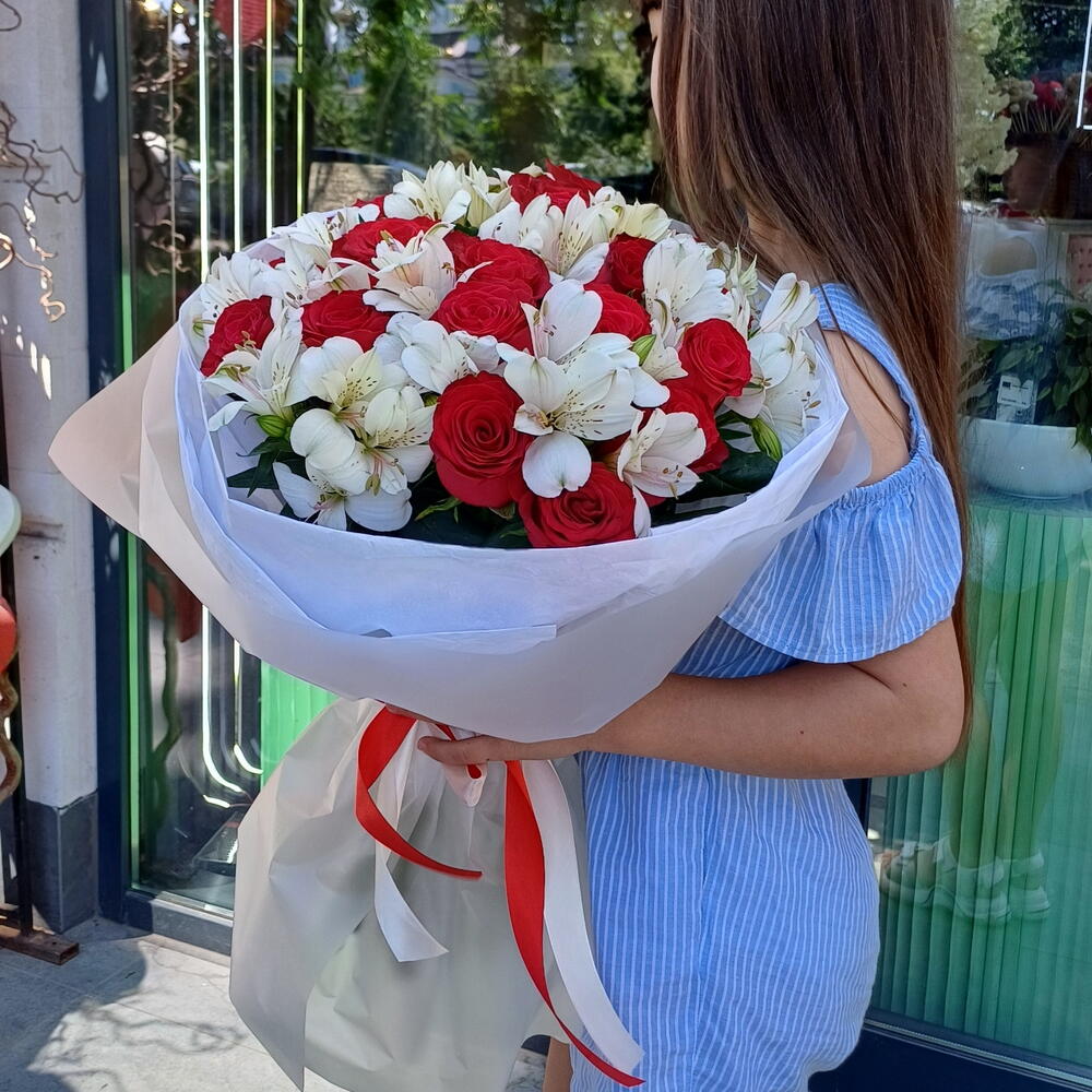 Alstroemeria - 8 pcs Rose - 19 pcs Satin ribbon - 2 pcs Silence - 4 pcs Korean film - 4 pcs