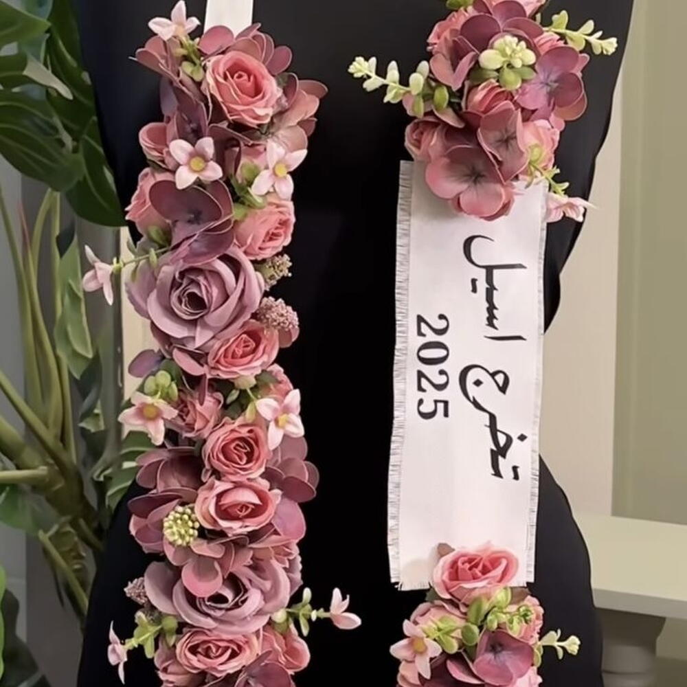 لعقد تخرج فاخر بتصميم أنثوي راقٍ من الزهور الوردية بدرجات ناعمة مع شال مخصص يحمل اسم الخريجة وسنة التخرج. تصميم أنيق ومميز يضيف لمسة فخامة في يوم التخرج.