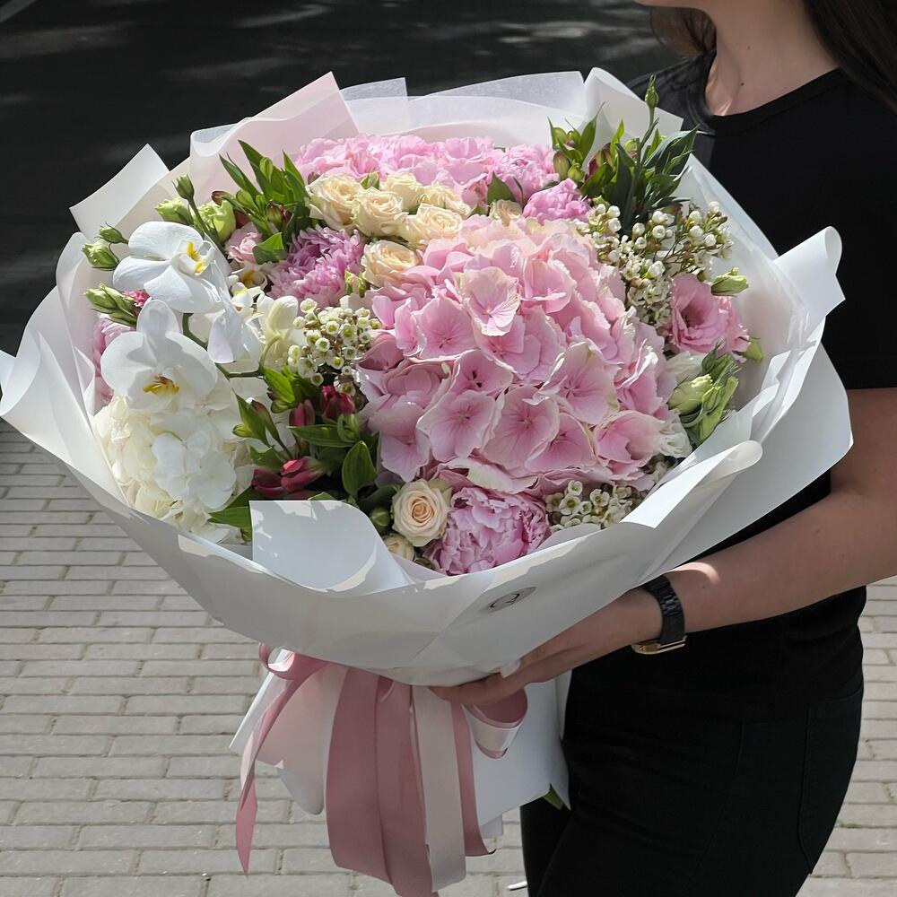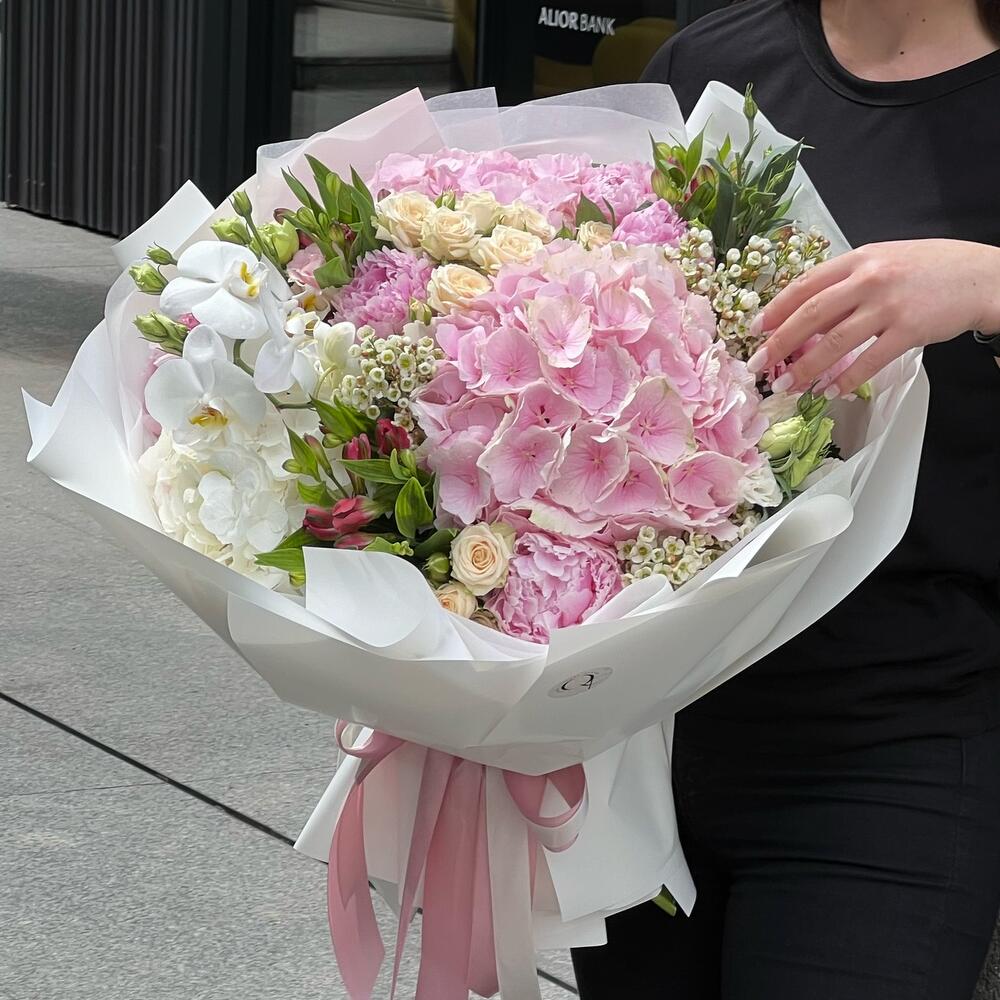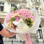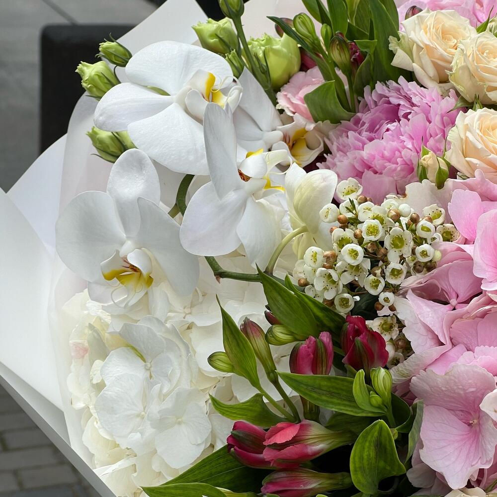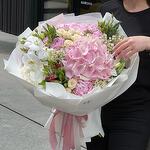 Eustoma - 5 pcs Hydrangea - 3 pcs Alstroemeria - 5 pcs Orchid - 1 pcs wax flower - 3 pcs roses - 9 pcs carnation Dianthus - 7 pcs