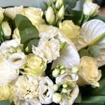 An excellent bouquet consists of elegant white Eustomas (3 pcs.), exotic anthuriums (2 pcs.), fresh eucalyptus (4 pcs.), fragrant carnations (5 pcs.) and classic roses (6 pcs.). This exceptional floral arrangement is an ideal gift for anyone and for any occasion. Give a gift that will always be remembered. Note: All bouquets are handmade, so they may differ slightly from the photo on the website.