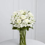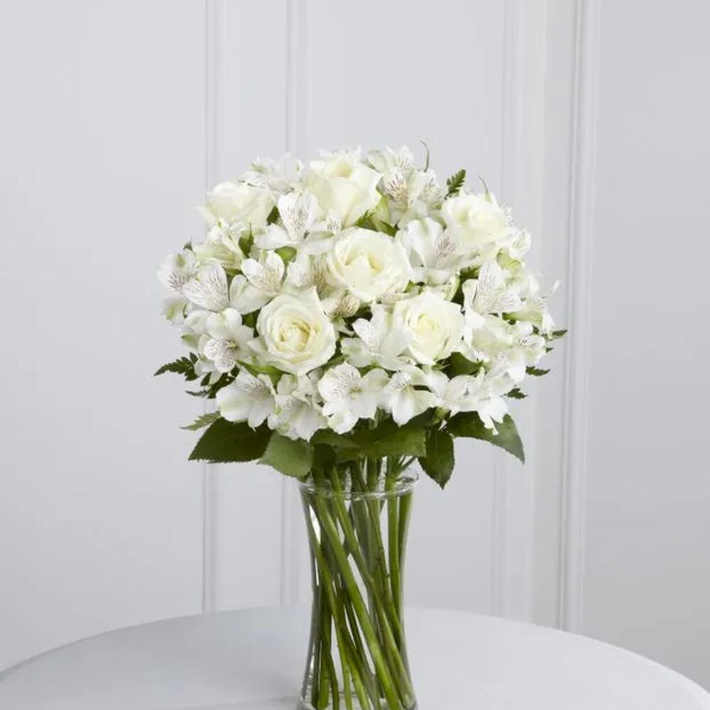 florero de cristal - 1 pcs astromelias - 20 pcs rosas brancas - 8 pcs follaje seleccionado - 1 pcs