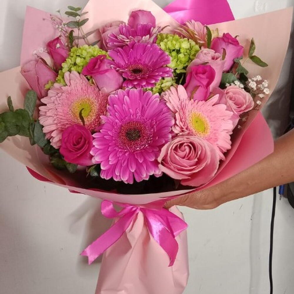 Indulge in a vibrant display of floristry featuring our specially selected arrangement. This bouquet boasts a beautiful combination of 3 gleaming Gerbera rosas, 3 radiant rosa fucsia, 4 charming perritos, 3 spectacular gerbera fiusha, and 3 stunning rosa hermosa in a delicate pink hue. This exquisite floral composition creates a visually striking melange of colors and an aromatic symphony guaranteed to bring a touch of exuberance to any room. Whether as a gift or a personal treat, its a lovely way to express heartfelt sentiments.