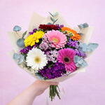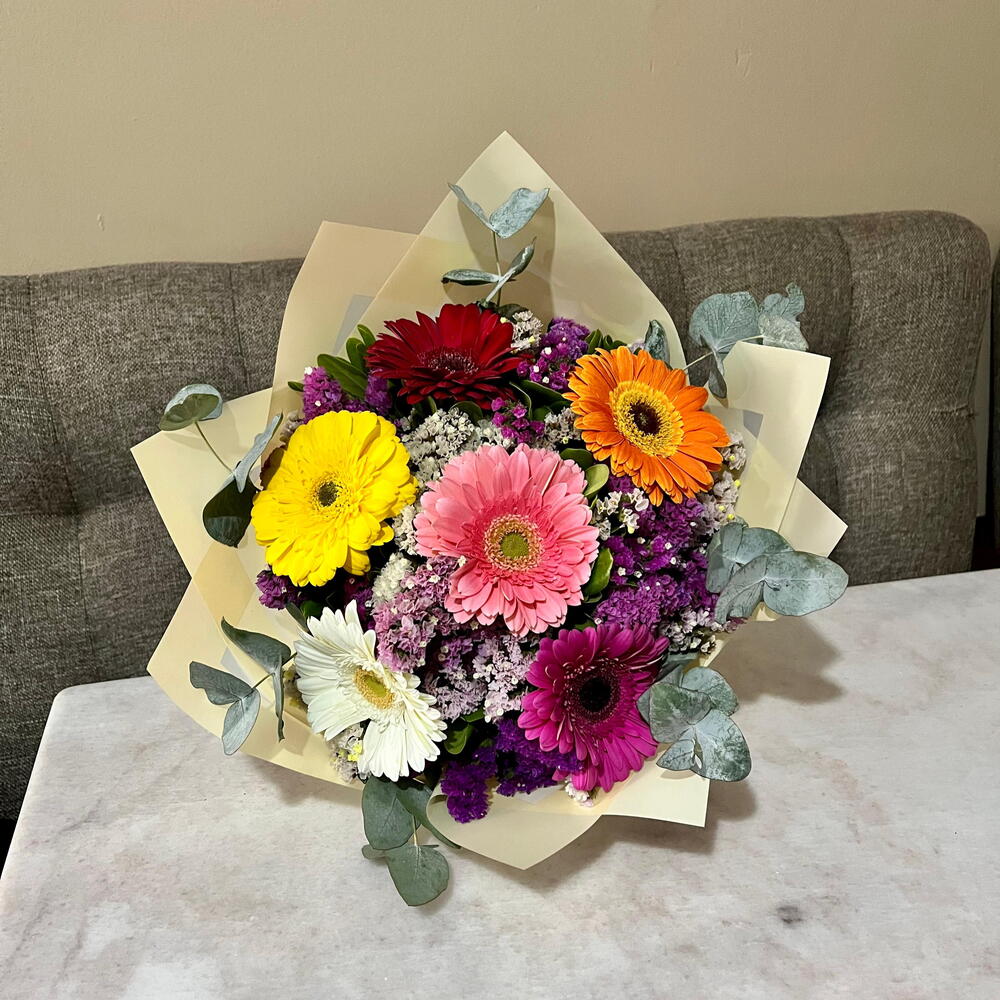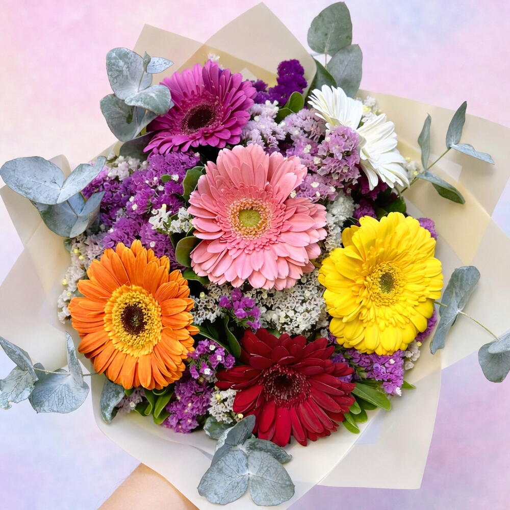 Llena cualquier momento de color y alegría con este hermoso ramo de gerberas en tonos vibrantes: rosa, amarillo, naranja, rojo y blanco, acompañadas de delicadas flores de complemento y follaje fresco de eucalipto. Un diseño moderno, fresco y lleno de vida, perfecto para cumpleaños, agradecimientos, aniversarios o simplemente para sorprender 💖