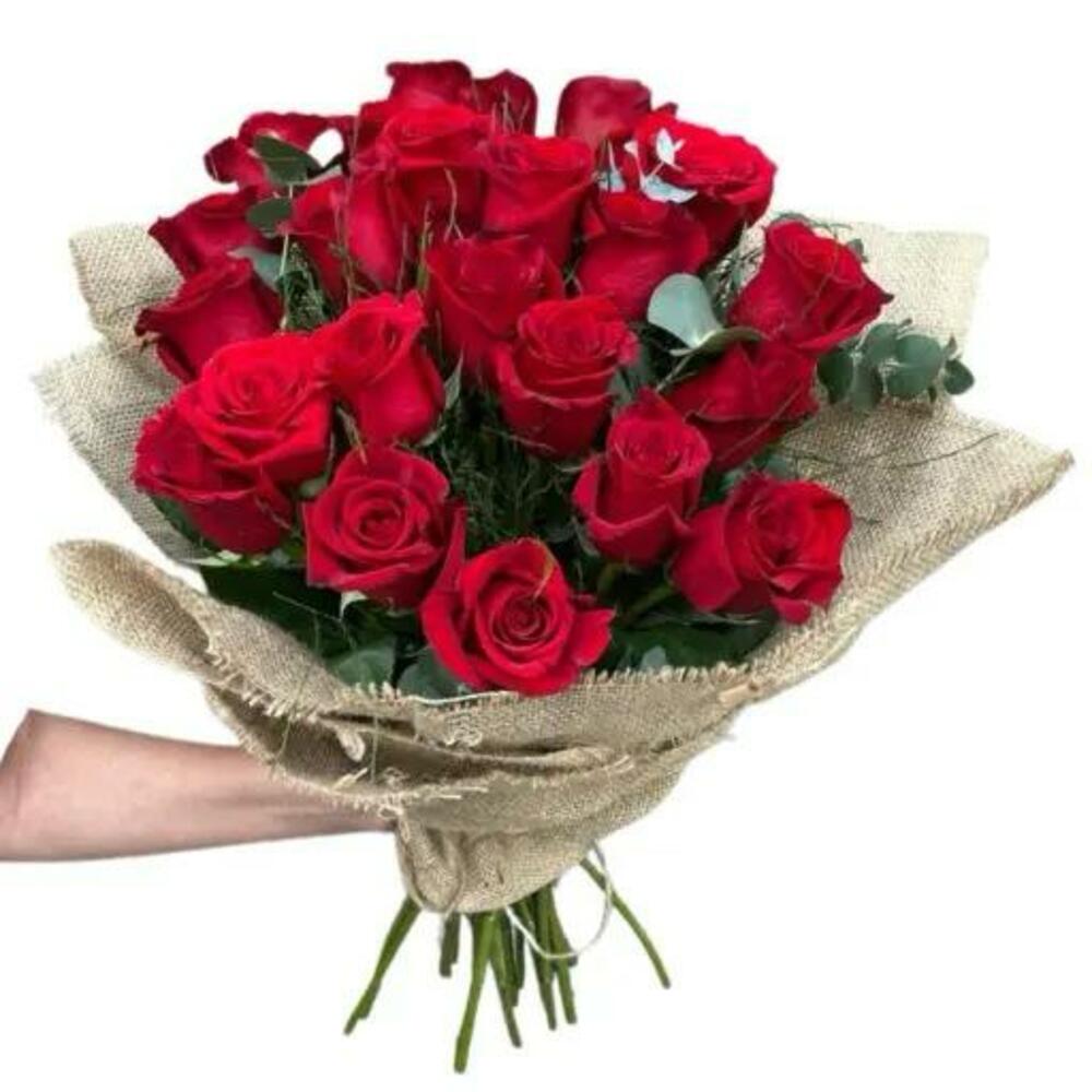 24 rosas rojas importadas de Ecuador envuelto con arpillera. Ideal para regalar en cualquier ocasión.