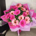 Ramo de gerberas rosas y fiushas envueltas en papel floral