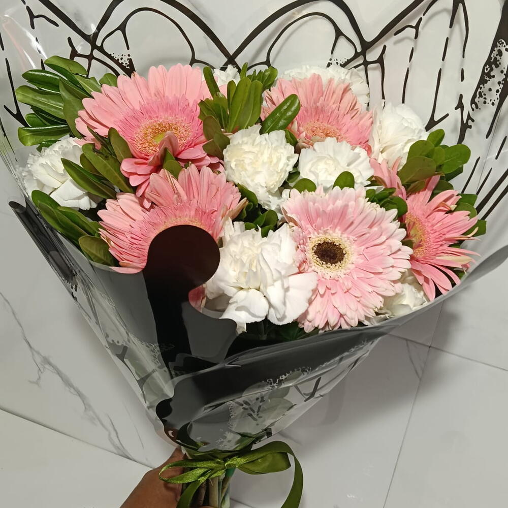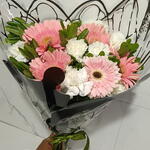 Ramo de Gerberas rosas con claveles blancos