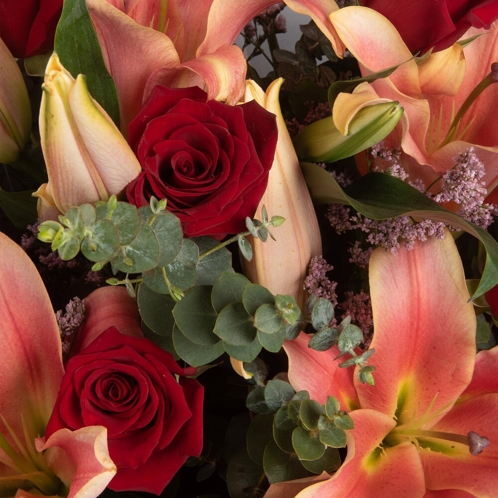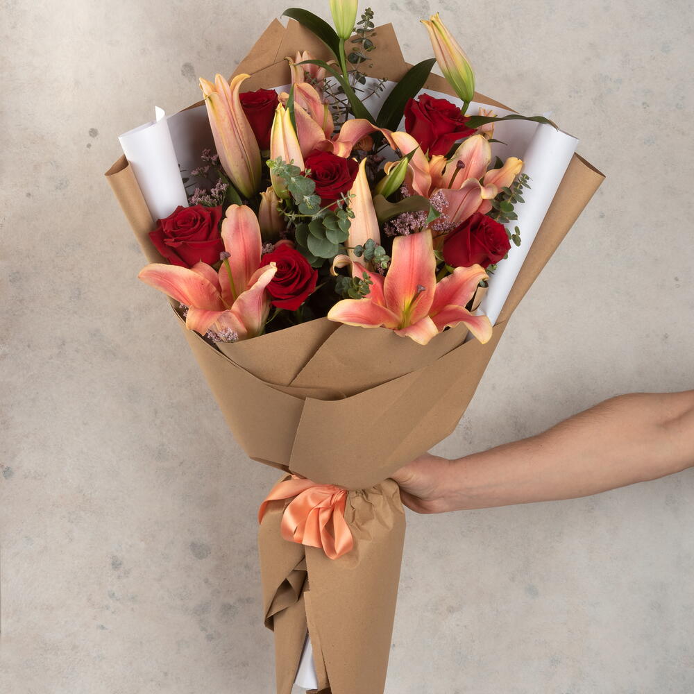 Ramo de liliums y rosas decoradas con follajes envuelto en doble papel con lazo de raso.