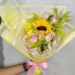 Solidago - 3 pcs rosas rosadas - 3 pcs follaje - 5 pcs girasoles - 1 pcs