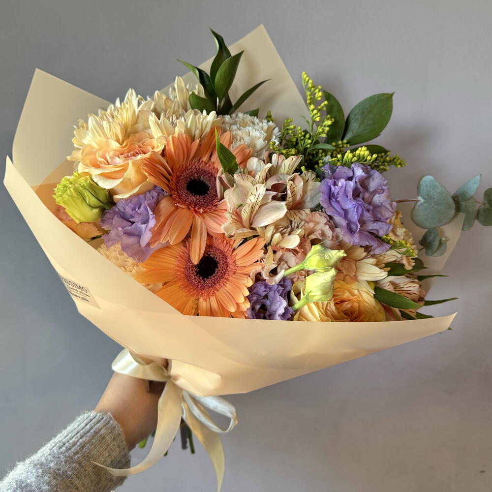 Ramo mediano con flores mixtas en tonos suaves damascos y lilas,