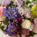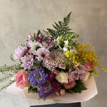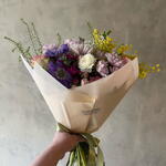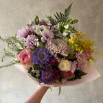 Solidago - 2 pcs Gerbera - 2 pcs follaje verde - 3 pcs alstromerias - 2 pcs claveles - 2 pcs escabiosa - 2 pcs perrito - 1 pcs alelis - 1 pcs maules - 3 pcs rosa ecuatoriana - 1 pcs