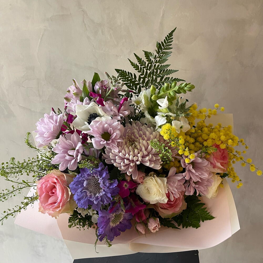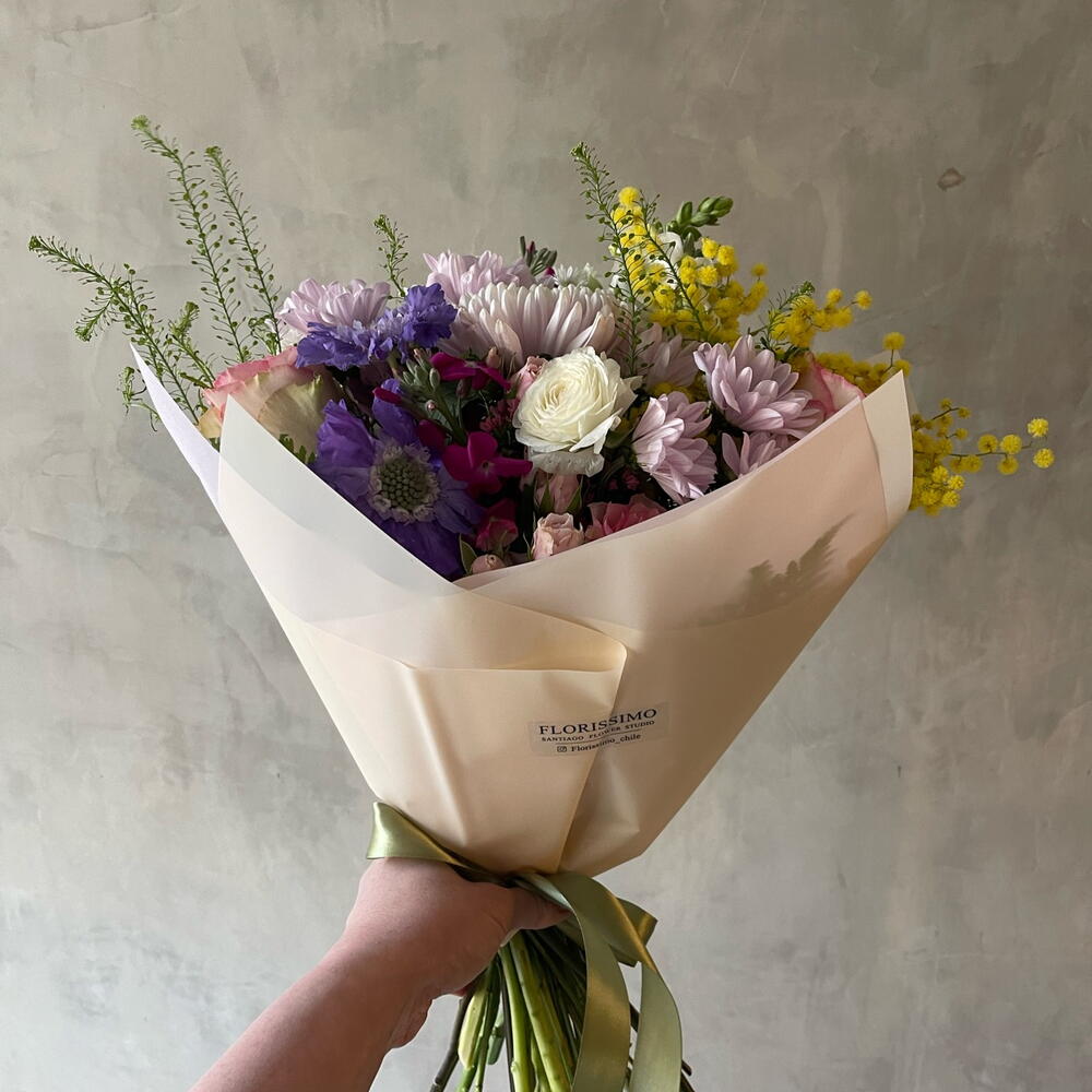 Solidago - 2 pcs Gerbera - 2 pcs follaje verde - 3 pcs alstromerias - 2 pcs claveles - 2 pcs escabiosa - 2 pcs perrito - 1 pcs alelis - 1 pcs maules - 3 pcs rosa ecuatoriana - 1 pcs