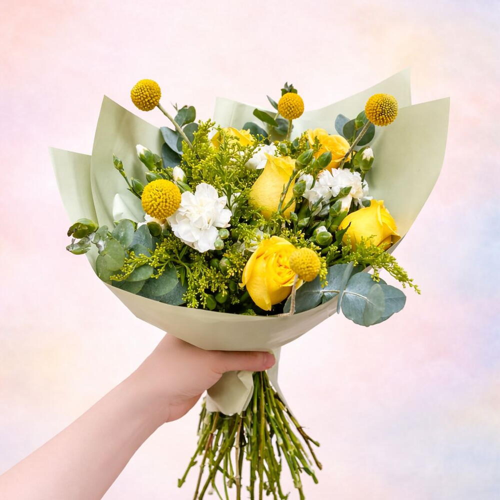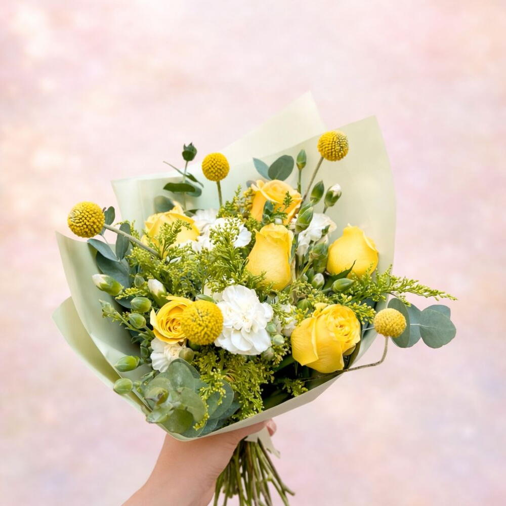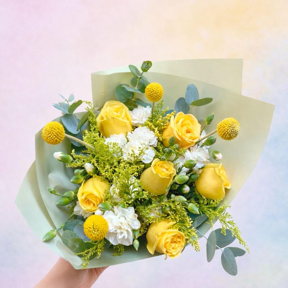Promesa Amarilla es un ramo lleno de luz, alegría y significado. Diseñado con hermosas rosas amarillas, delicadas clavelinas blancas, craspedia y solidago, este arreglo floral transmite optimismo, cariño y nuevos comienzos. Las rosas amarillas simbolizan amistad, felicidad y buenos deseos, convirtiendo este ramo en el detalle perfecto para sorprender a alguien especial. Cada ramo es elaborado con flores frescas seleccionadas y envuelto en papel premium que resalta su elegancia y belleza natural.