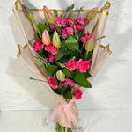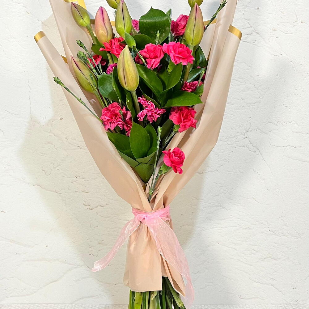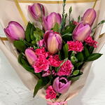 Ramo de tulipan rosa con clavelina fiusha y follajes. Envuelto en papel.