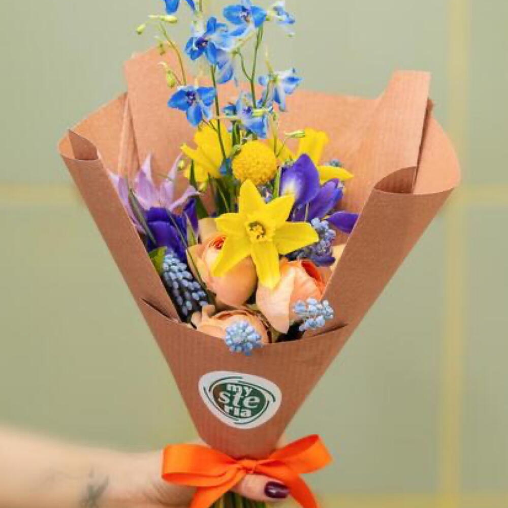 Iris - 2 pcs Muscari - 10 pcs ranunculus - 5 pcs craspedia - 1 pcs narcissus - 2 pcs delfinium - 1 pcs