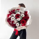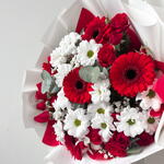 Eucalyptus - 5 pcs Gerbera - 3 pcs Gypsophila - 2 pcs Chrysanthemum white - 3 pcs spray rose red - 3 pcs