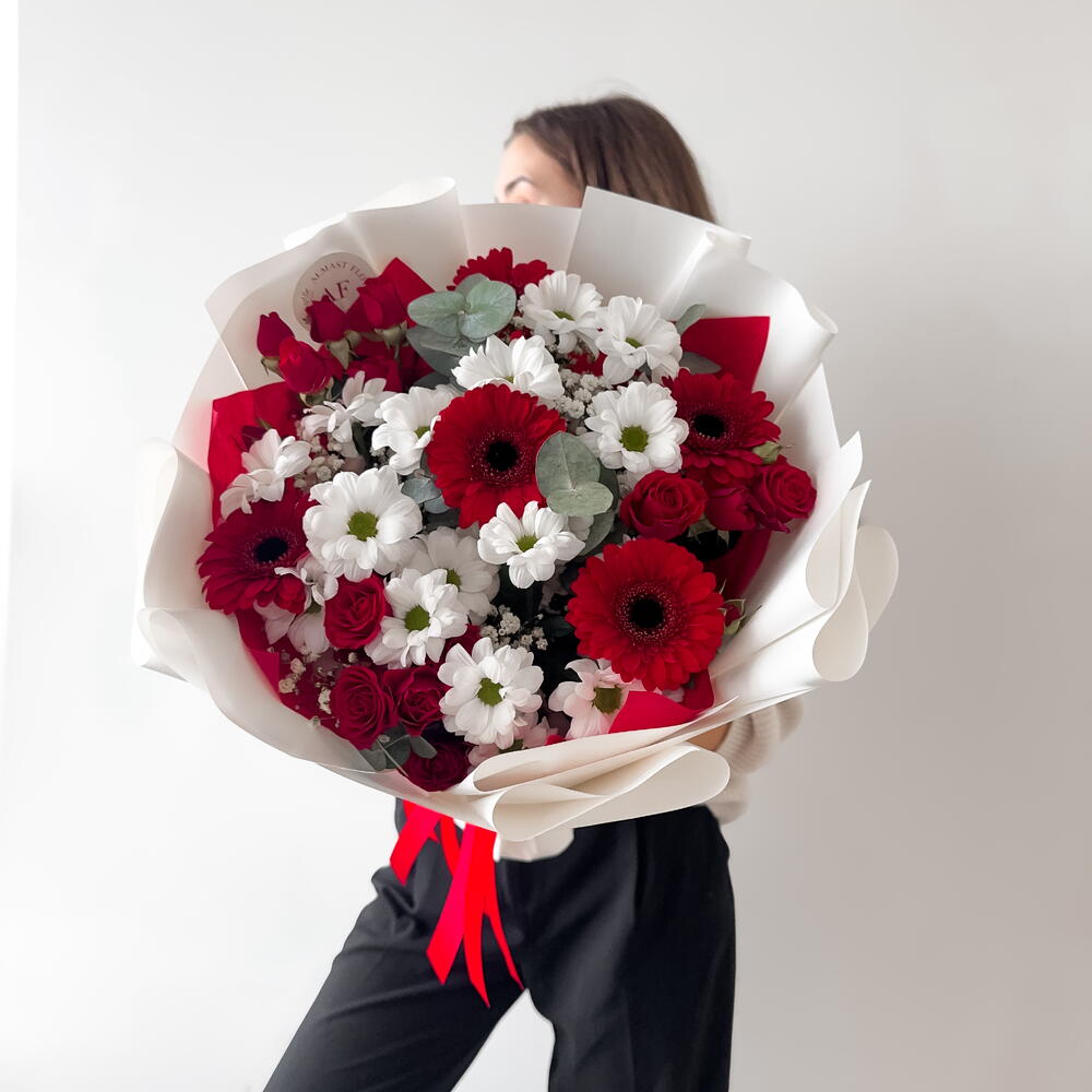 Eucalyptus - 5 pcs Gerbera - 3 pcs Gypsophila - 2 pcs Chrysanthemum white - 3 pcs spray rose red - 3 pcs