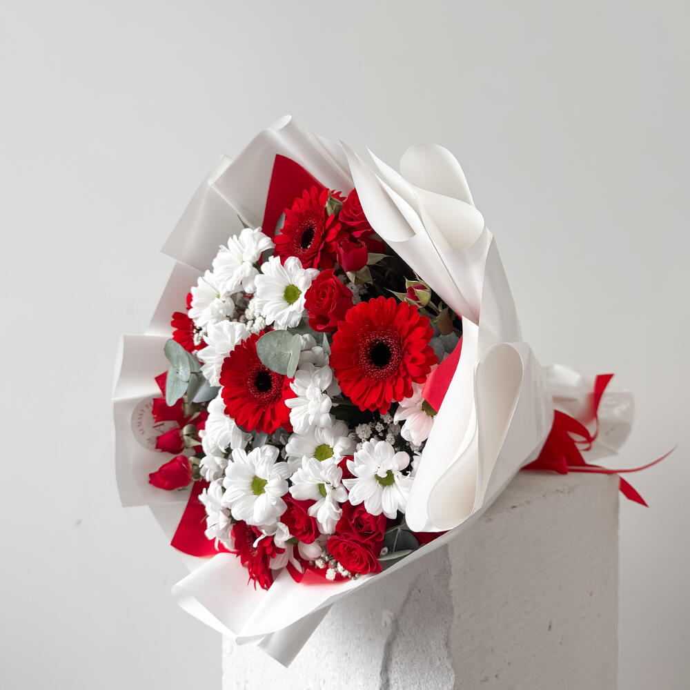 Brighten up any room with this stunning arrangement from our Florists Specials. This bouquet is a blend of natural beauty, featuring 5 lush Eucalyptus stems, 3 vibrant Gerberas, delicate sprinkles of 2 Gypsophila pieces, 3 pristine white Chrysanthemums, and topped off with 3 juicy red Spray Roses. This beautiful blend is perfect for bringing a touch of nature into your home or making any occasion memorable.