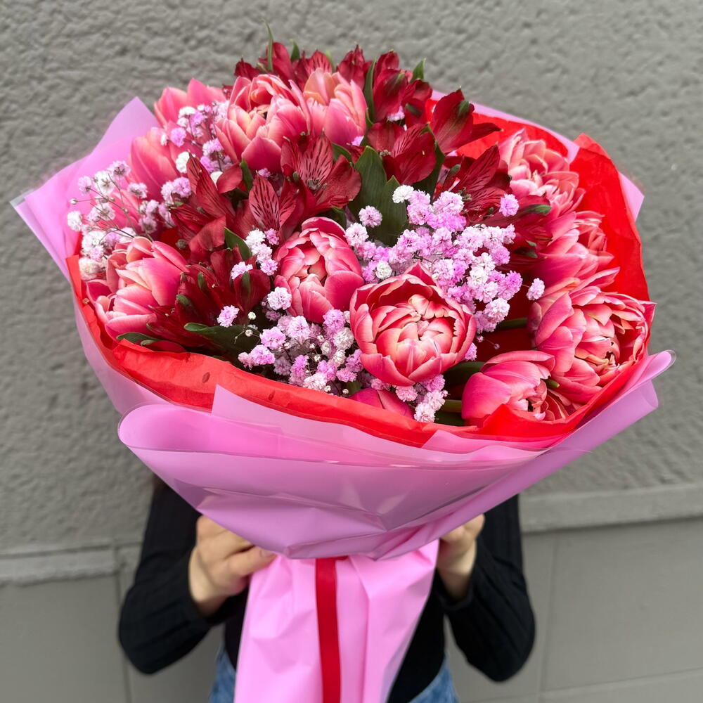 tulip - 15 pcs astromeria - 4 pcs gypsophila - 1 pcs decorative paper - 1 pcs