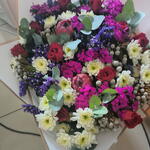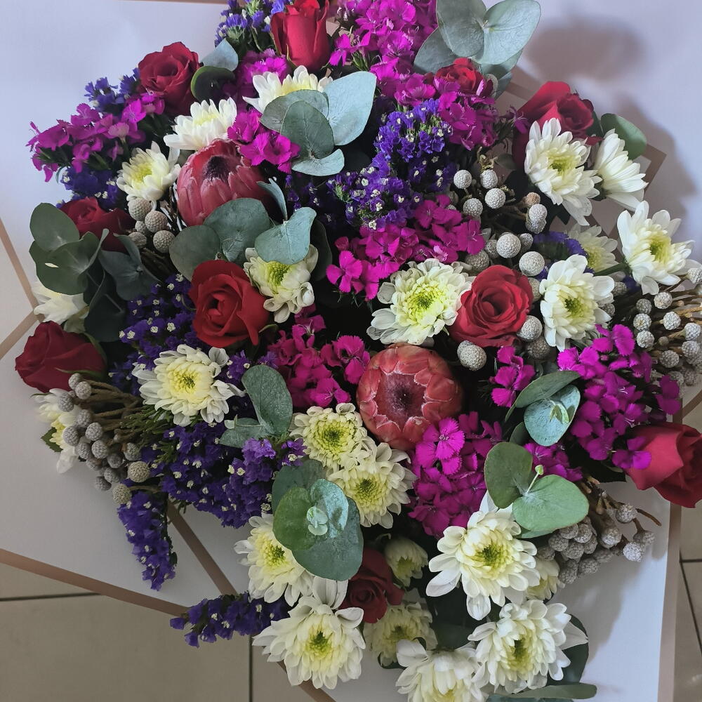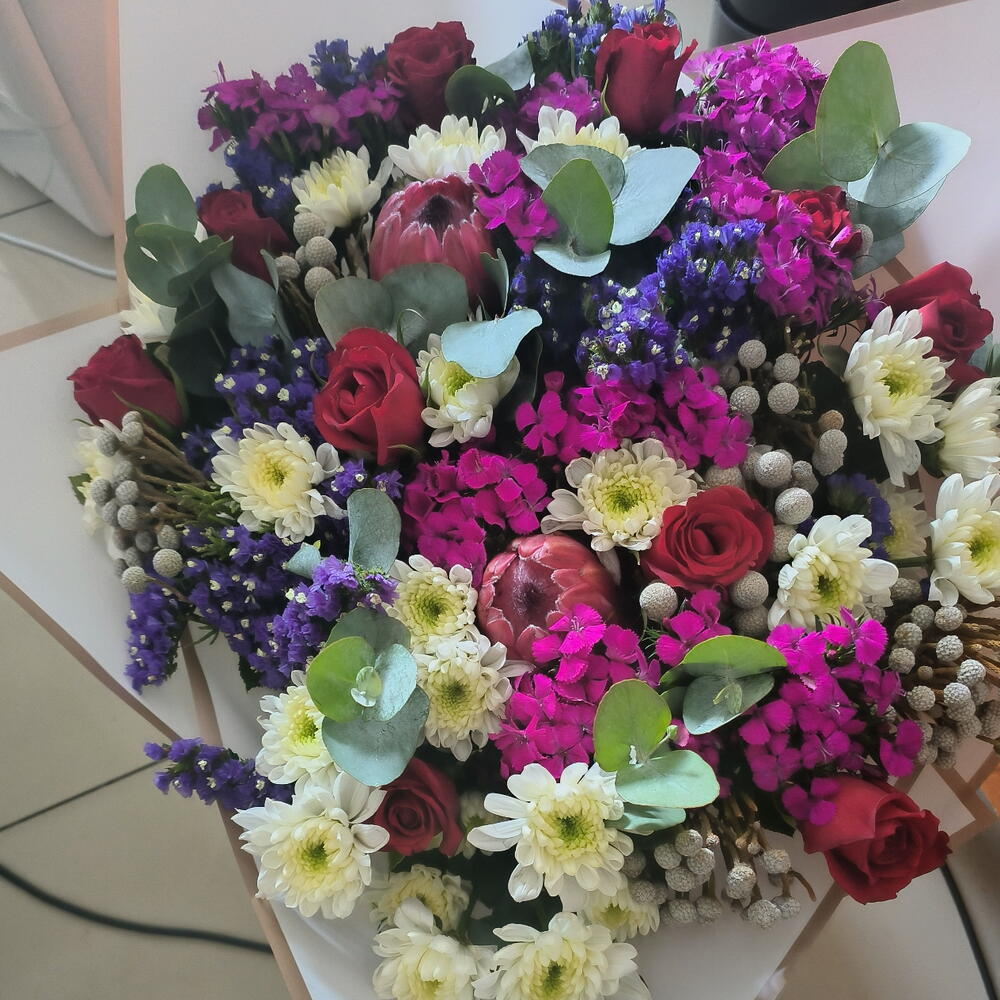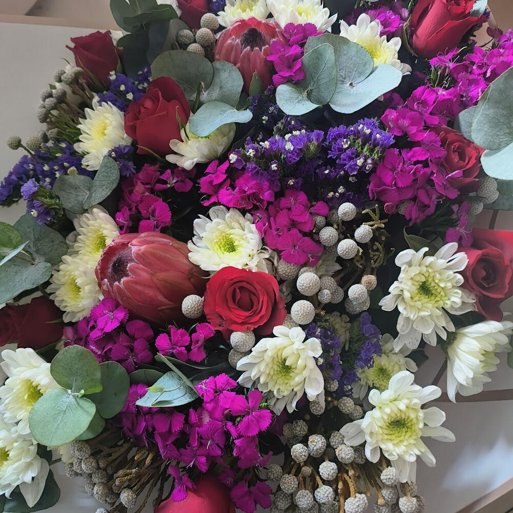 Red roses, pink proteas, white chrysenthemums, pink sweet Williams, silver brunia, eucalyptus in a beautiful large bouquet